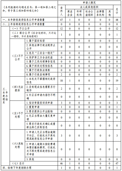 (二)规范办理依申请公开。健全政府信息依申请公开登记、审核、办理、答复、归档工作制度,加强工作规范。严格按照《中华人民共和国政府信息公开条例》认真推进政府信息公开申请受理、办理,确保答复内容于法有据、严谨规范。全年共受理政府信息公开申请48件,办理因政府信息公开引起的行政复议7件,行政诉讼2件。