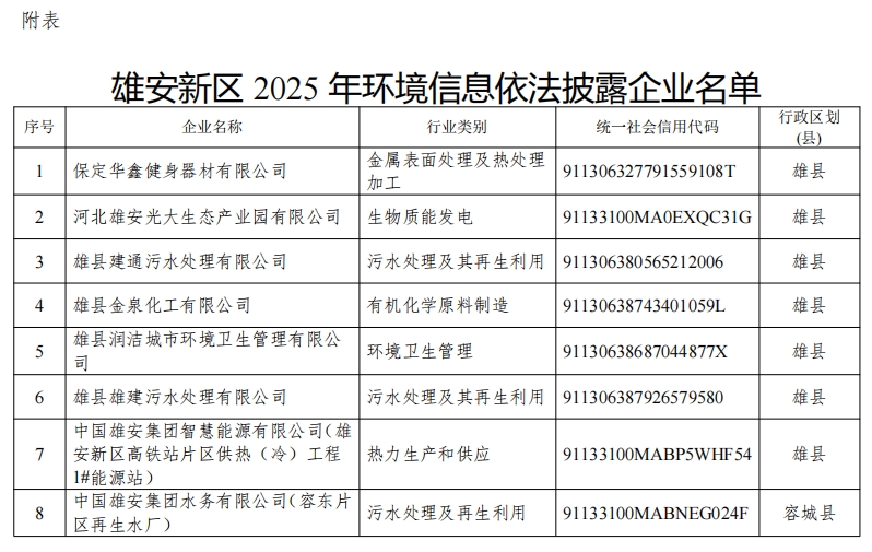 附表:雄安新区2025年环境信息依法披露企业名单