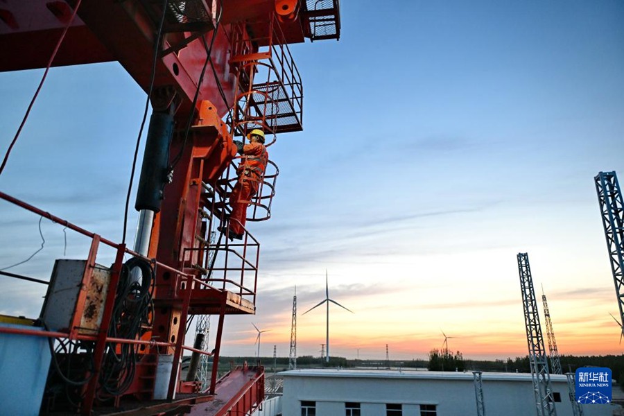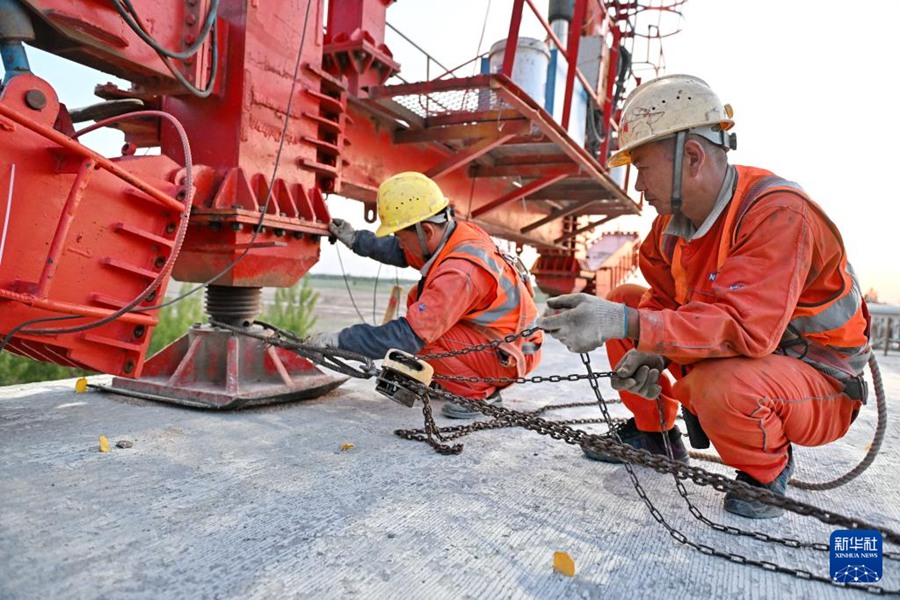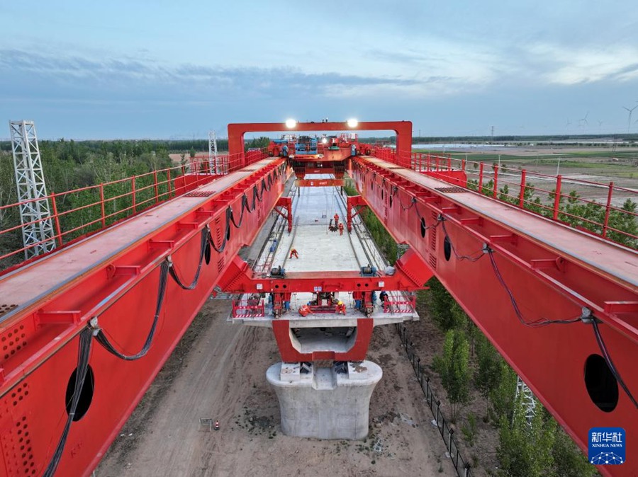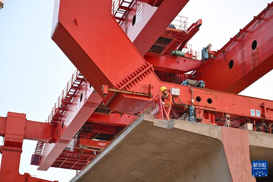 4月27日,中铁二十局集团工人在雄商高铁河北段最后一孔箱梁架设现场作业。新华社记者牟宇 摄