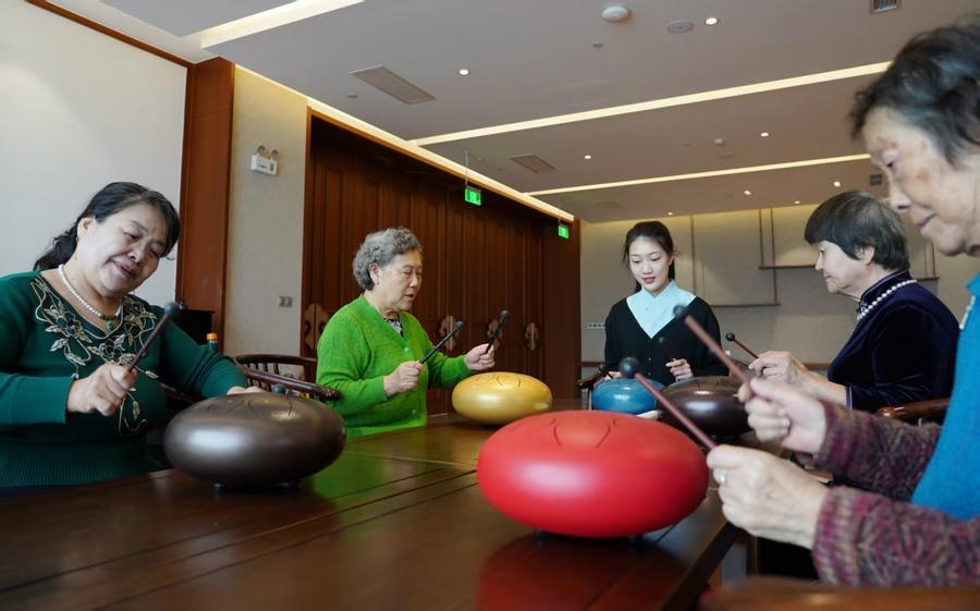 固安来康郡康养中心的入住老人在进行演奏练习。新华社发