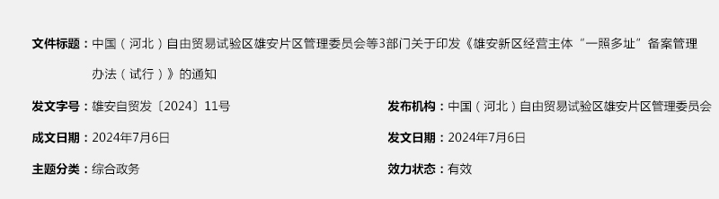 中国(河北)自由贸易试验区雄安片区管理委员会等3部门关于印发《雄安新区经营主体“一照多址”备案管理办法(试行)》的通知