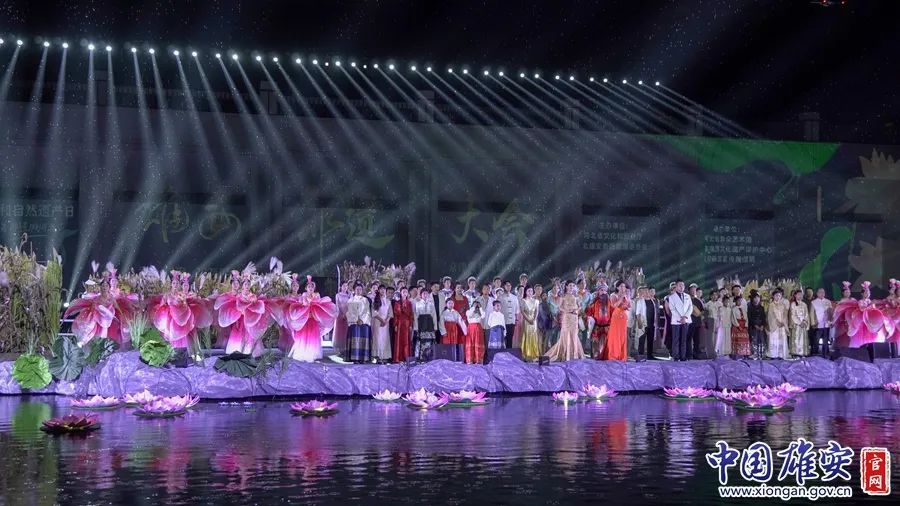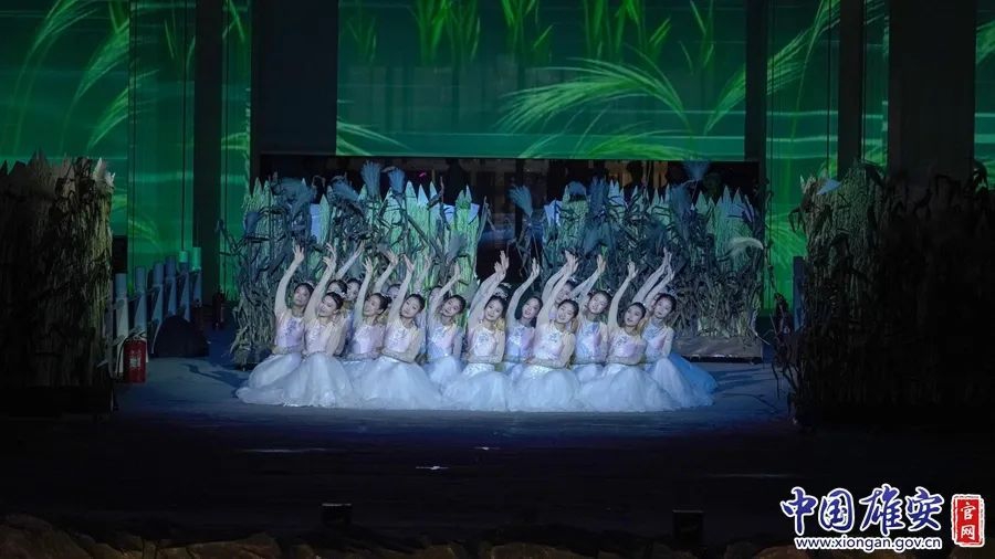 6月13日晚,非遗展演在震撼炫目的水幕光影秀《九龙成淀》中拉开帷幕,营造出虚实相生的沉浸式场景。巧妙运用雄安商务服务中心环形水幕与楼体投影交相辉映,以现代光影技术,生动描绘了雄安“九龙戏水成巨淀”的古老传说。随后,如梦如幻的舞蹈《芦花飞扬》翩跹而至,芦苇丛装置与舞者表演完美融合,将观众带入一幅意境优美、充满诗意的“湿地芦苇画”中。