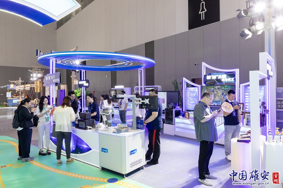 “雄‘据’天下、智周万物”档口展台模拟雄安城市计算中心建筑造型,集中呈现了雄安新区在人工智能技术与城市治理、产业发展、群众生活的深度融合与创新实践成果。观众与独角兽企业梅卡曼德机器人交互,沉浸式体验雄安智慧康养科技AI健康检测一体机等智慧康养服务,现场互动体验氛围热烈。一系列紧贴生活场景、赋能未来的智能产品与应用,令参展企业代表与观众深刻感受到雄安新区创新驱动发展的澎湃动能。