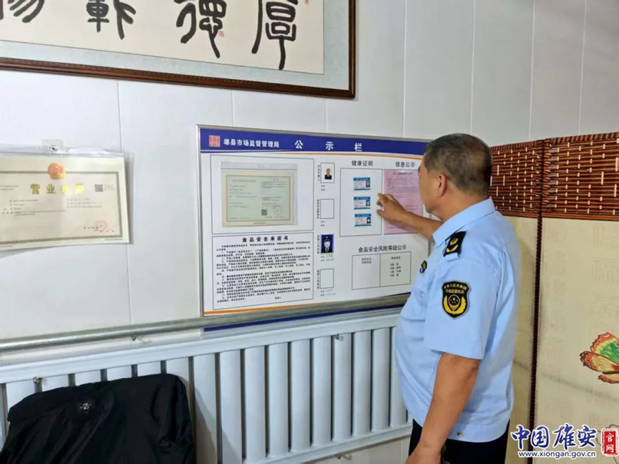 雄县市场监督管理局执法人员在餐饮企业检查工作人员证件。雄县县委宣传部供图