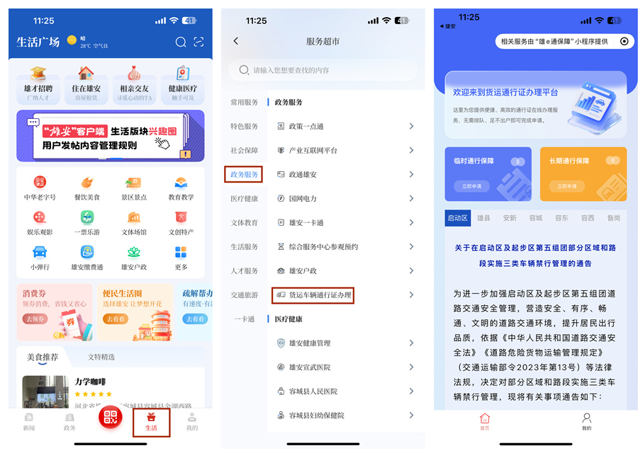 下载“雄安”App,点击生活→更多→政务服务→货运车辆通行证,填写有关信息,并上传车辆行驶证、驾驶员驾驶证、服务建设项目证明等材料。