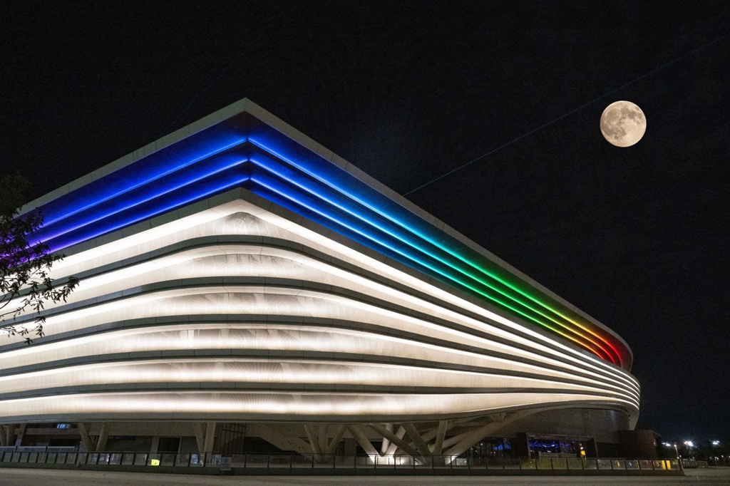 10月6日晚,在雄安体育中心拍摄的中秋圆月。雄安媒体中心王伟倩 摄(二次曝光)