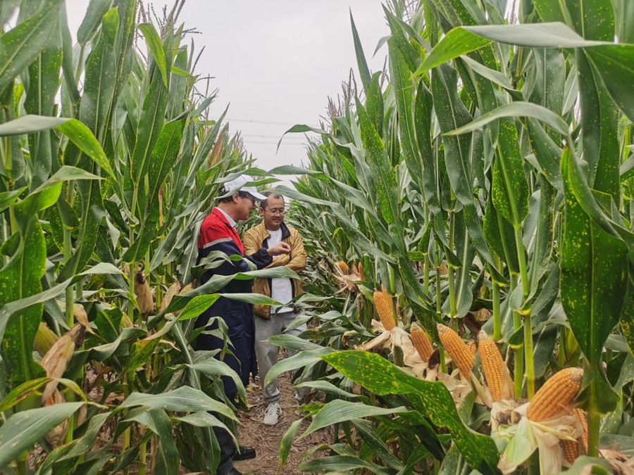 专家在玉米田讲解籽粒成熟度。雄安新区农业农村局供图