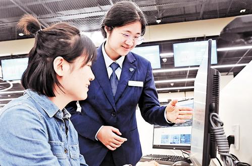 10月31日,雄安新区政务服务中心,工作人员(右)协助办事群众通过线上智能客服“雄小智”办理业务。记者刘光昱 摄